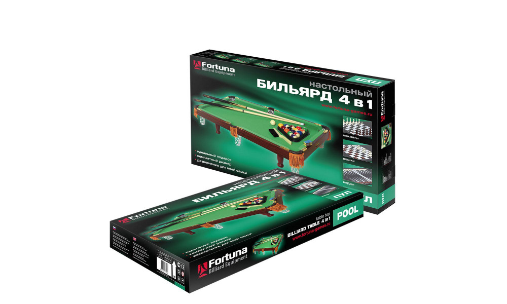 Бильярдный стол Fortuna Пул 3 фута 4 в 1 - это многофункциональный игровой стол, включающий 4 игры: американский бильярд, шашки, шахматы и нарды.